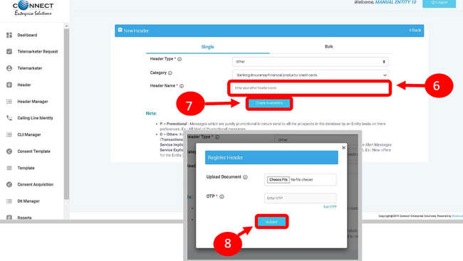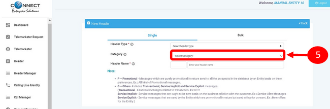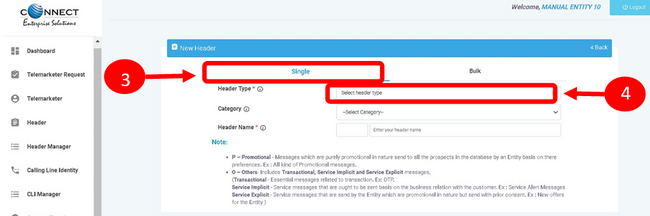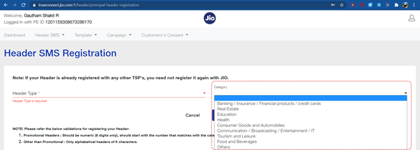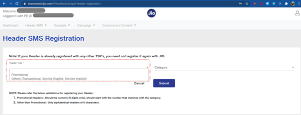 - Fill the requisite details such as header category, Header type, sender ID / header and