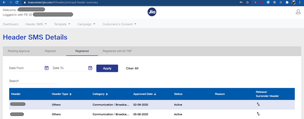 Every principal entity need to register header with access providers as per the procedure