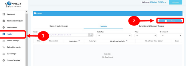 - Select SMS Headers and then select "Add Header" in header page.